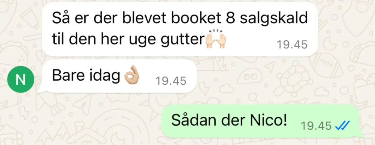 Det koster i alt 10.000 kr. for forløbet. Vi har valgt at gøre det sådan, at man kun betaler 100 kr. af dette beløb i starten. 30 dage efter betalingen af de 100 kr. vil du månedligt blive opkrævet 2.500 kr. i 4 måneder. Men kun hvis du har fulgt vores rådgivning og fået et salg (se vores handelsbetingelser nederst på siden). Vi har valgt at gøre det sådan her, så du kan få salg inden du behøver betale os et større beløb.